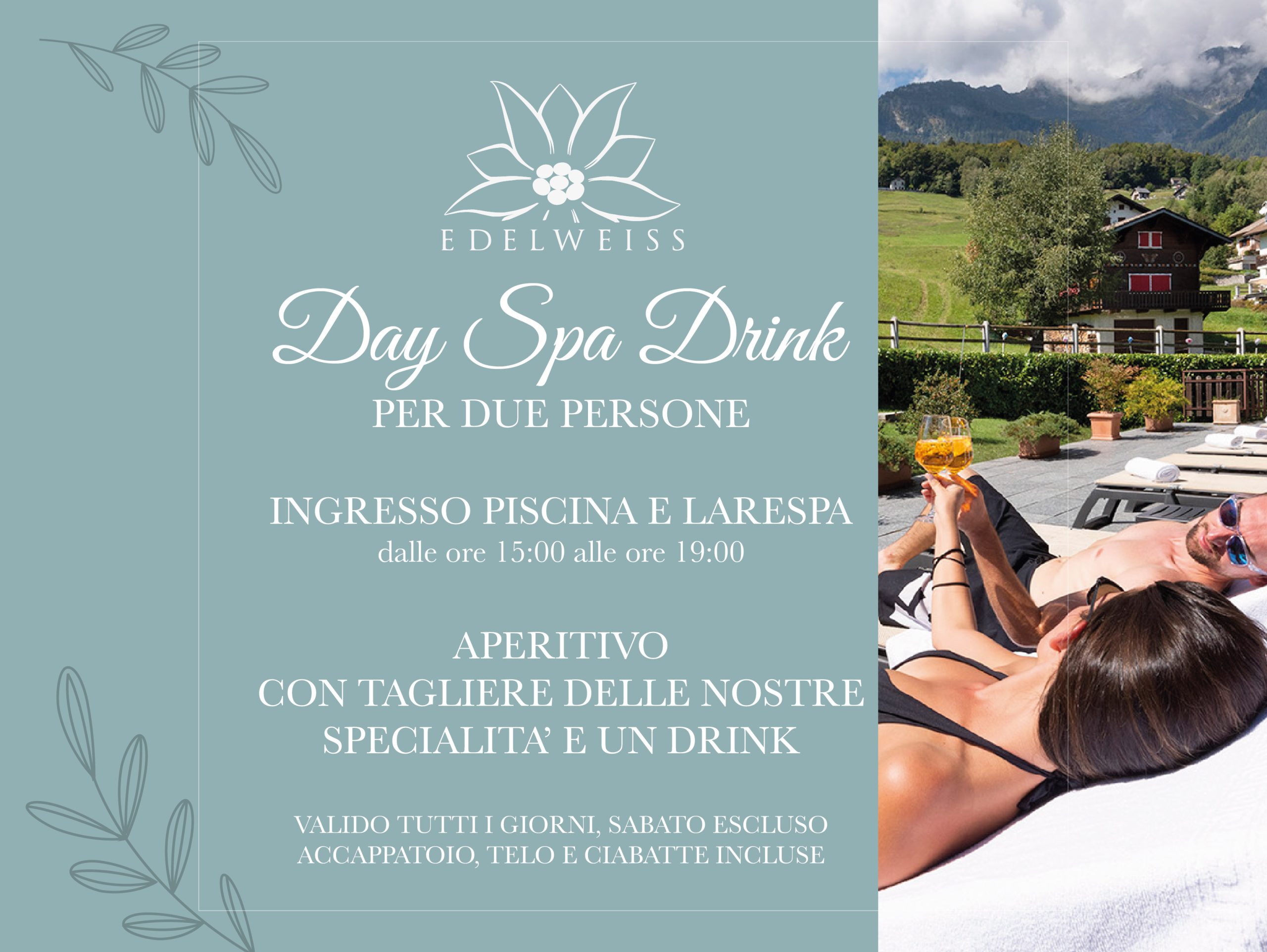 Bisogna volersi bene, sempre. Per questo abbiamo pensato a questa esperienza nella Larespa, dedicata anche agli ospiti esterni che vogliono godersi qualche ora di benessere e attimi di serenità. E dopo il relax, vi attende un ricco aperitivo presso la nuova sala/bar con un tagliere delle nostre specialità e un drink alcolico o analcolico.